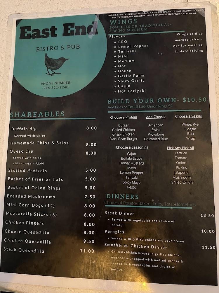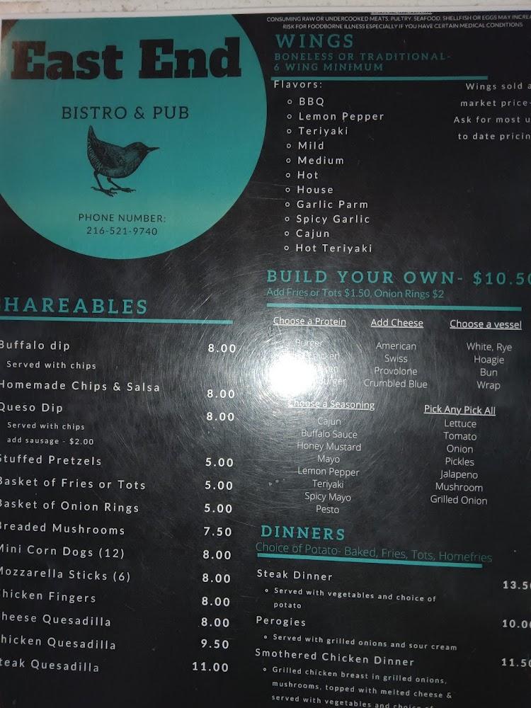 Welcome to East End Bistro & Pub, where good friends gather for exceptional food and fun entertainment! Located in Lakewood, OH, our inviting space features a cozy fireplace, expansive drink selections, and a lively atmosphere with karaoke and games. Whether you’re enjoying a casual brunch, a solo dinner, or a night out with friends, we offer a diverse menu of traditional dishes, craft cocktails, and local specialties. With options for outdoor seating, takeout, and quick service, we cater to every need. Join us for happy hour specials, and experience the perfect blend of food and fun at East End Bistro & Pub!