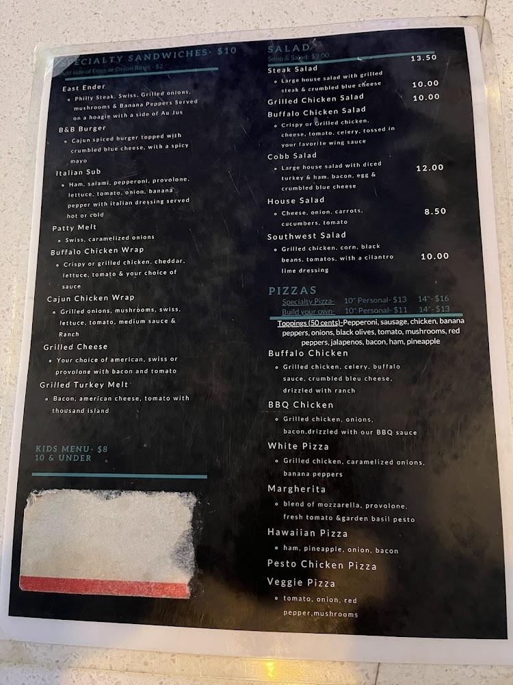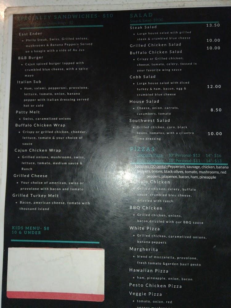 The East End Bistro & Pub offers a diverse menu that caters to all tastes. Options range from hearty steaks and chicken dinners to light salads and shareable appetizers. Popular items include the Buffalo Chicken Wrap and the B&B Burger. The steak salad is a fan favorite for those looking for something fresh yet filling. Guests appreciate the variety of pizzas available, such as BBQ Chicken and Margherita. The shareable appetizers, like queso dip and pretzels, make for a great start to meals. A wide selection of beers, including local crafts, enhances the dining experience. Overall, the menu reflects the bistro's commitment to quality and local flavors.